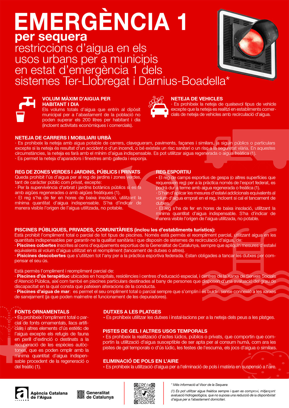 Per a més informació sobre les restriccions en fase d'emergència consulteu l'Acord de Govern per a l'estat d'emergència per sequera de la Generalitat de Catalunya.