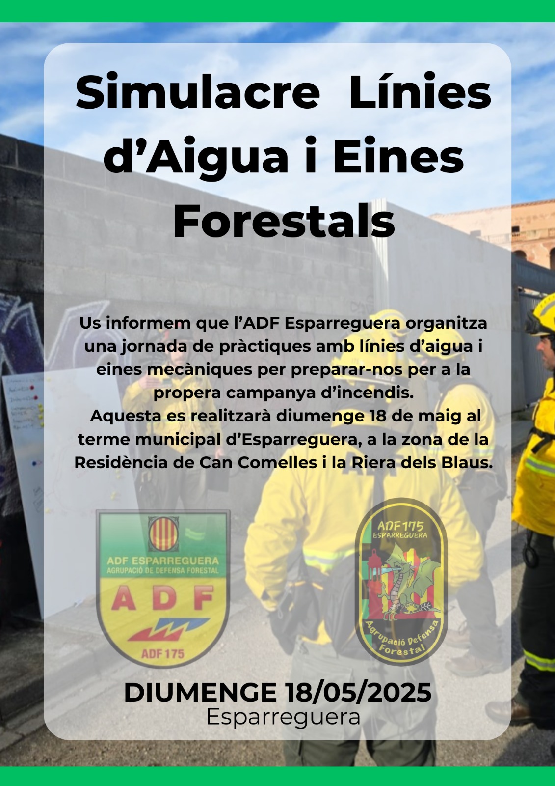 El diumenge 18 de maig, de les 9 del matí a les 2 del migdia, Esparreguera acollirà un simulacre i jornada de pràctiques amb línies d'aigua i eines mecàniques amb la participació de l'Equip de Prevenció Activa Forestal (EPAF) dels Bombers de la Generalitat de Catalunya, els Bombers de Martorell, l'ADF d'Esparreguera i altres ADF convidades com les de Vallirana i les de Torrelles de Llobregat. La pràctica operativa de simulacre d’incendi de forestal començarà a la Riera del Puig i s'estendrà fins a arribar a la zona propera de la Residència de Can Comelles. L'objectiu d'aquest simulacre és la preparació i coordinació dels diferents agents implicats en la gestió d'incendis per a la pròxima campanya d'incendis forestals d'estiu.