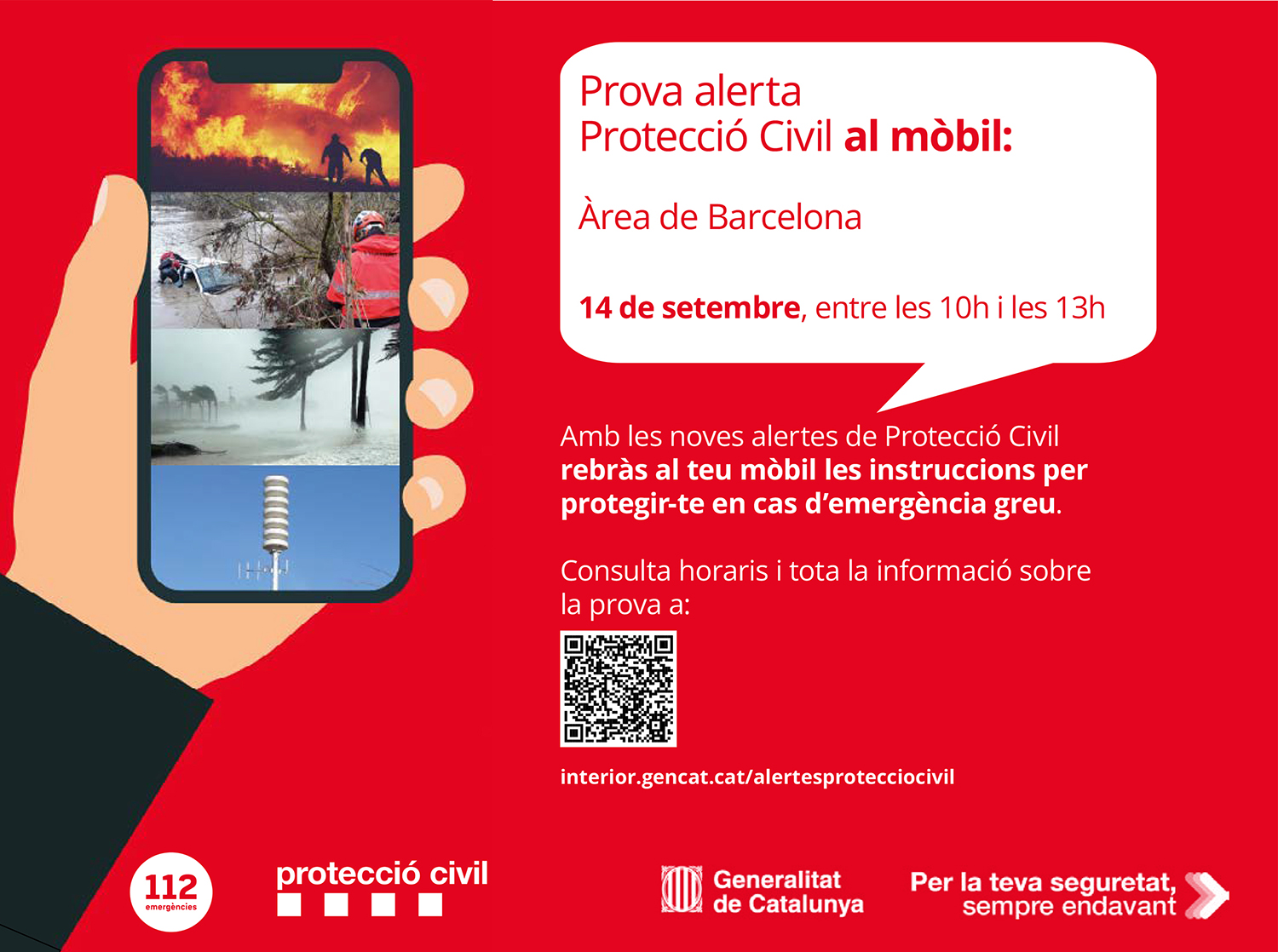 El proper dia 14 de setembre es realitzarà la prova a la vegueria de Barcelona. Tots els telèfons mòbils intel·ligents que es trobin a la vegueria de Barcelona (Barcelonès, Vallès Occidental, Vallès Oriental, Maresme i Baix Llobregat) rebran un missatge de prova del sistema d’alertes de Protecció Civil de la Generalitat.